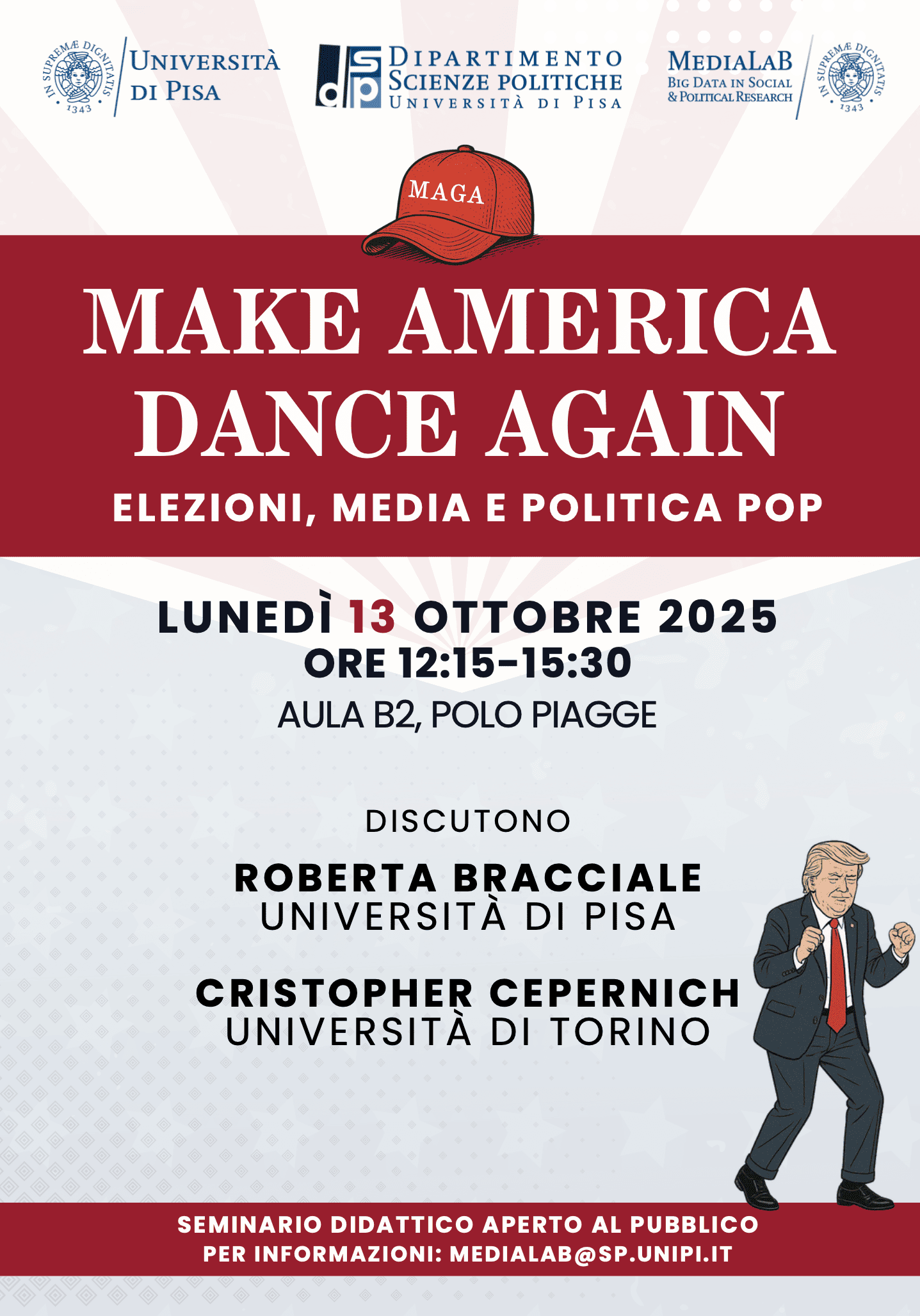 Lunedì 13 ottobre 2025 si terrà il seminario didattico “Make America Dance Again” in cui discuteranno Roberta Bracciale (Università di Pisa) e Cristopher Cepernich (Università di Torino). L’incontro…